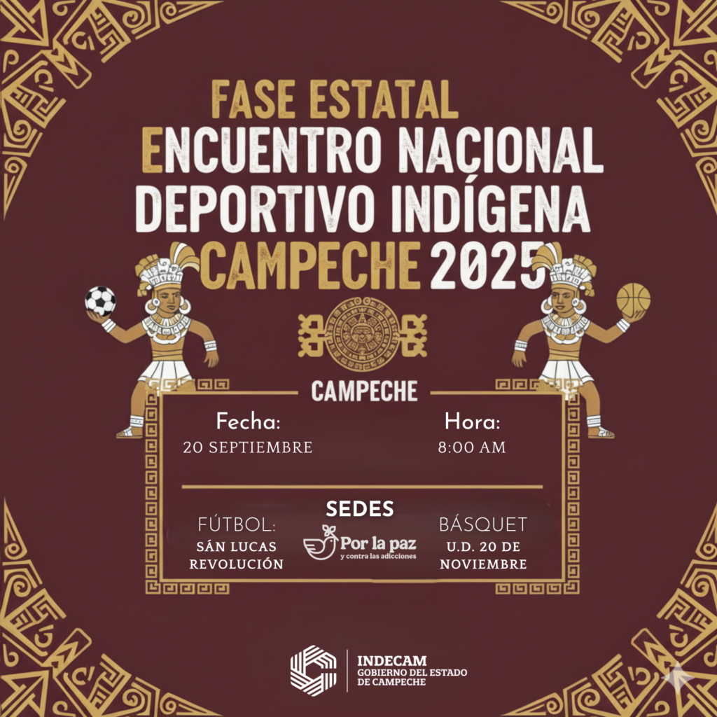 Este sábado 20 de septiembre, desde las 8:00 de la mañana se estará llevando a cabo a Etapa Estatal del Encuentro Nacional Deportivo Indígena 2025, en el campo de San Lucas con el fútbol y en las canchas de la Unidad Deportiva “20 de Noviembre” con el básquetbol, por lo que ya se tiene todo listo para recepcionar a los equipos inscritos.