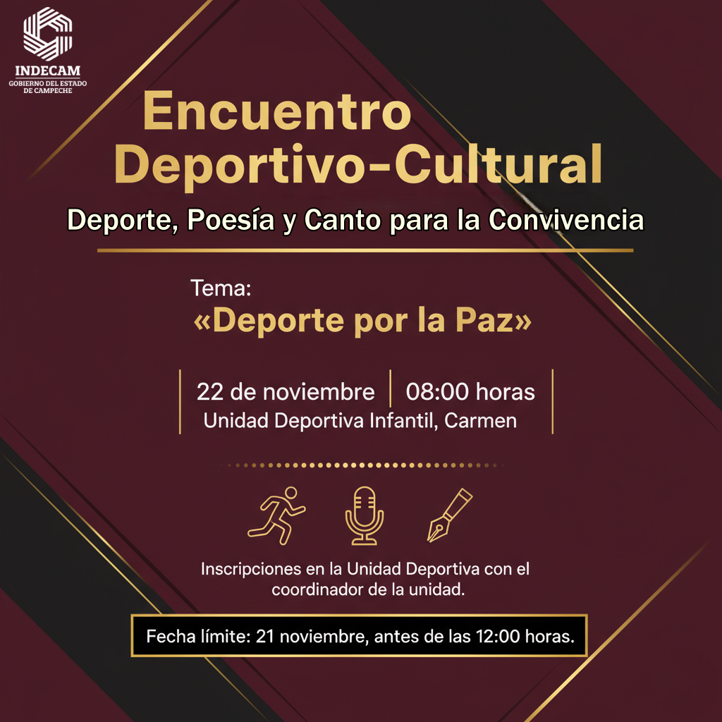 El Instituto del Deporte del Estado de Campeche (INDECAM), lanzó convocatoria dirigida a todos los deportistas del Municipio de Carmen, para participar en el Encuentro Deportivo Cultural, Poesía y Canto para la Convivencia denominado “Deporte por la Paz”, el cual se llevará a cabo el próximo 22 de noviembre en las instalaciones del CEDAR Carmen, desde las 8:00 de la mañana.